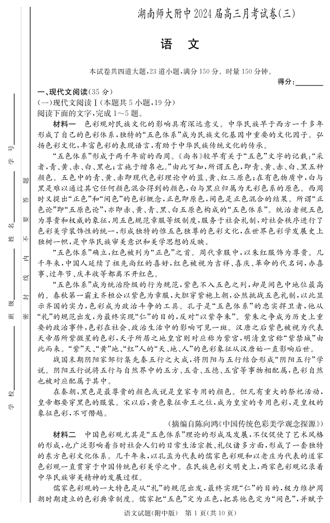 湖南省师范大学附属中学2024届高三上学期月考(三)语文
