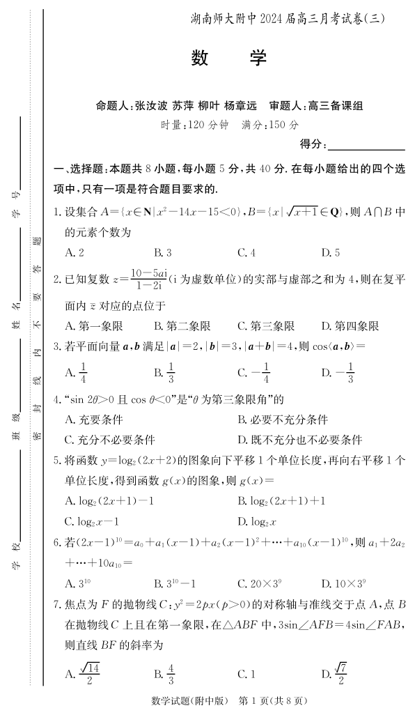 湖南省师范大学附属中学2024届高三上学期月考(三)数学