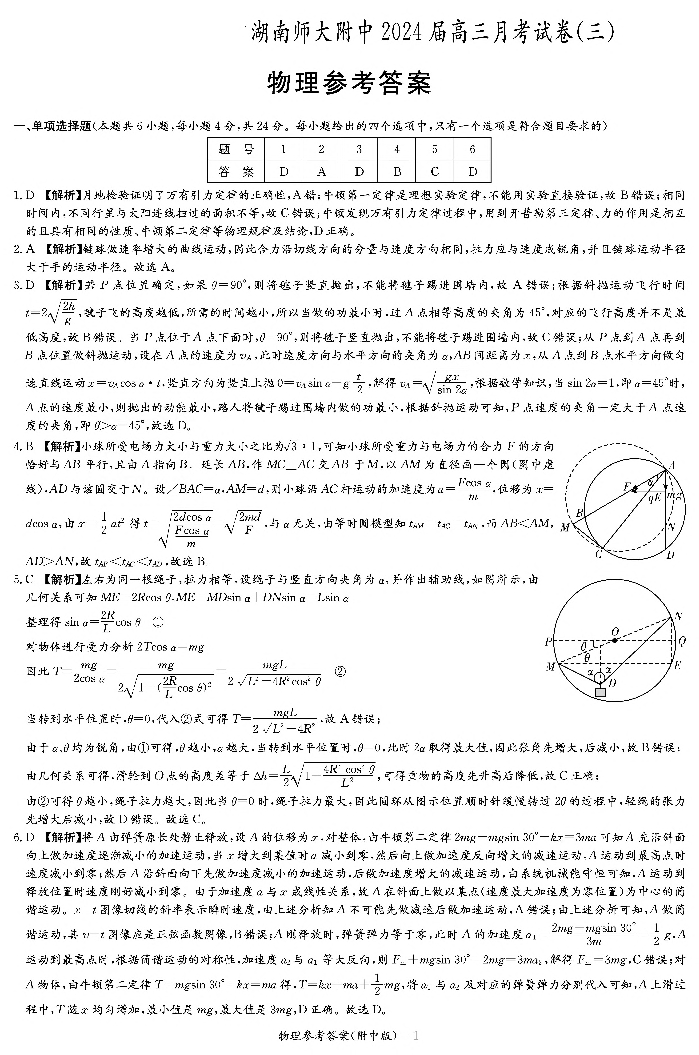 湖南省师范大学附属中学2024届高三上学期月考(三)物理答案