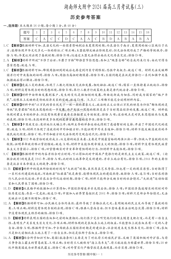 湖南省师范大学附属中学2024届高三上学期月考(三)历史答案