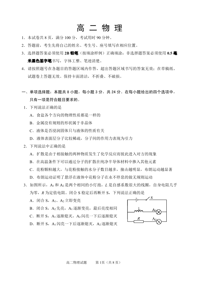 山东省威海市2024届下学期期末考试物理