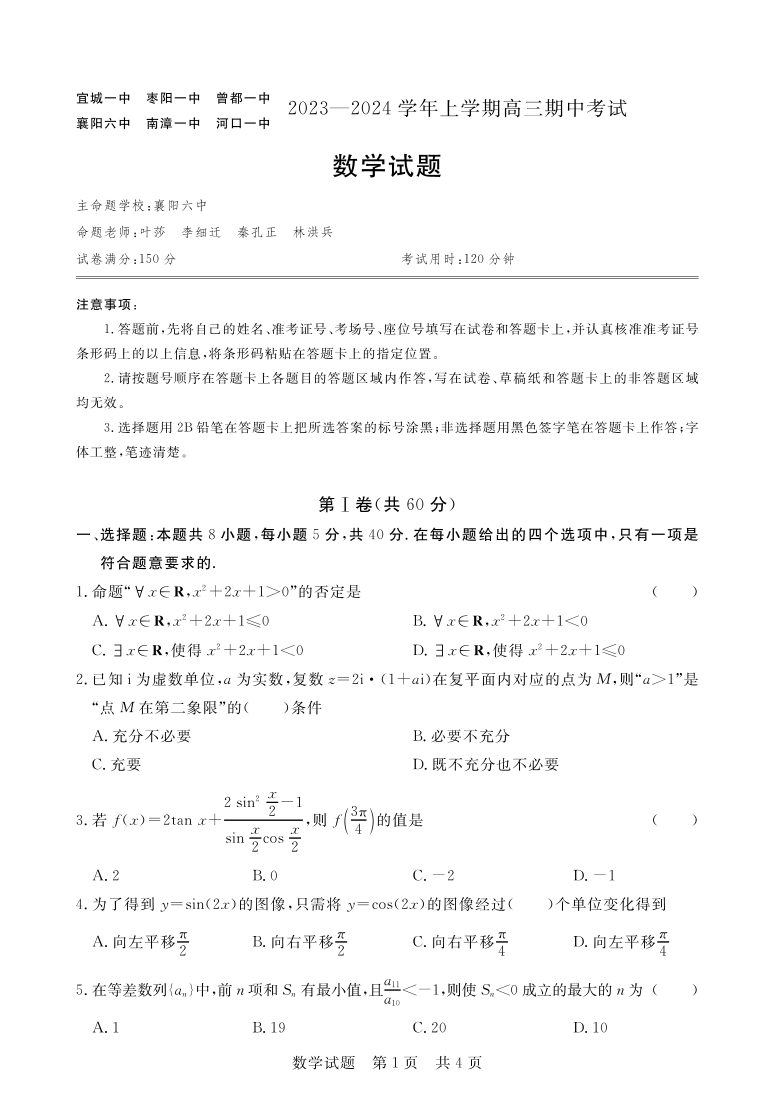 湖北省鄂东南六校2024届高三上学期期中考试数学