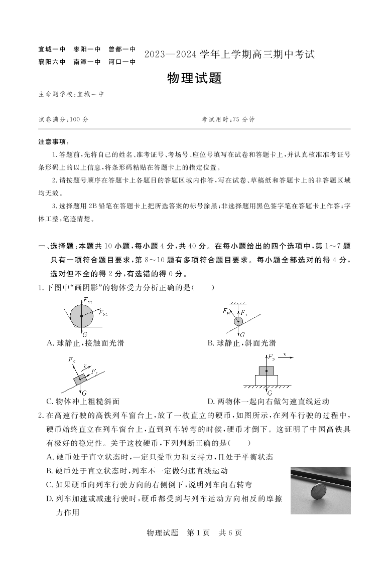 湖北省鄂东南六校2024届高三上学期期中考试物理