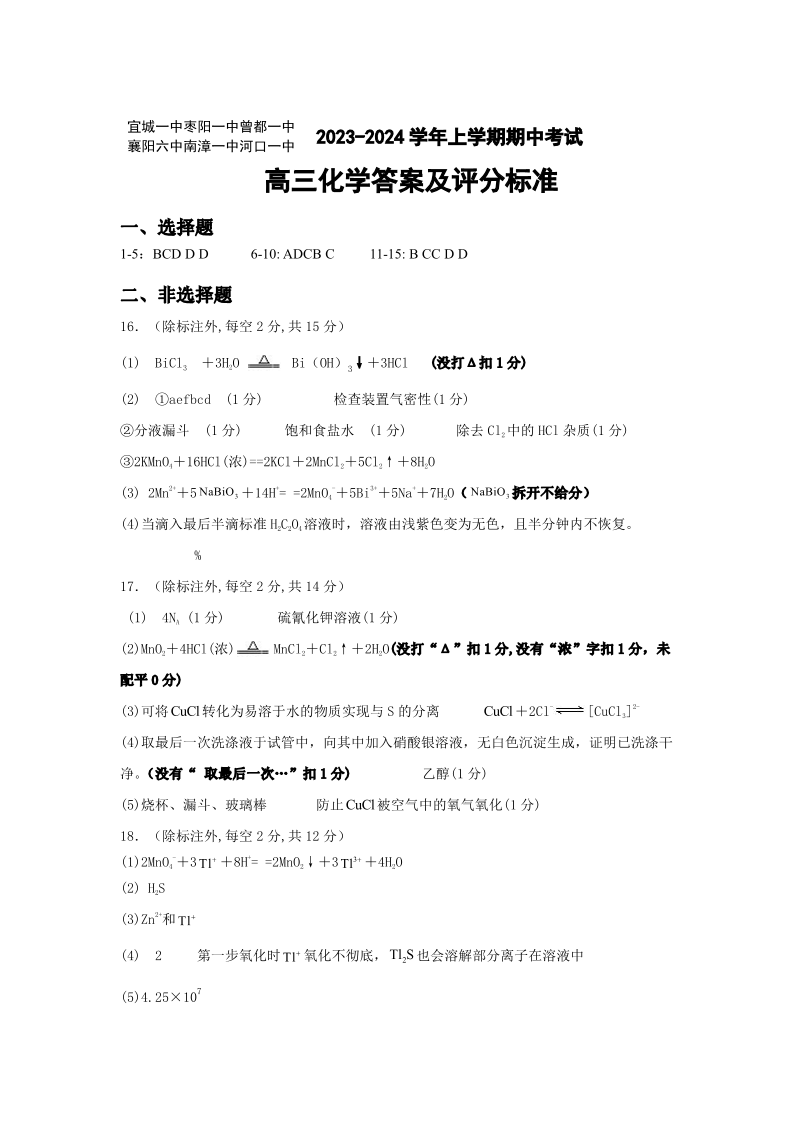 湖北省鄂东南六校2024届高三上学期期中考试化学答案