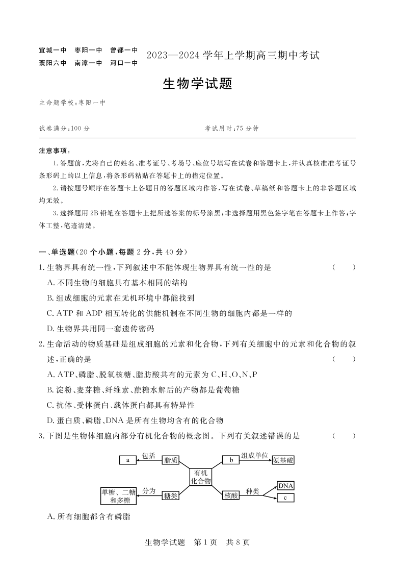 湖北省鄂东南六校2024届高三上学期期中考试生物