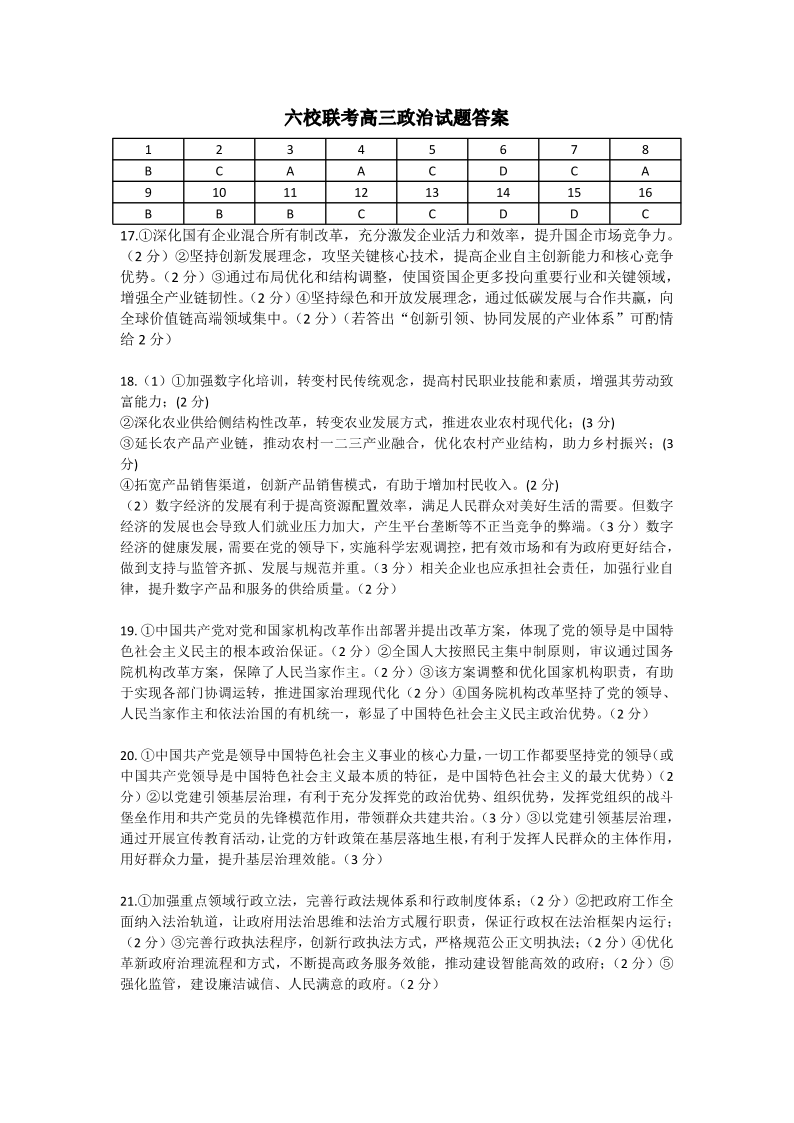 湖北省鄂东南六校2024届高三上学期期中考试政治答案
