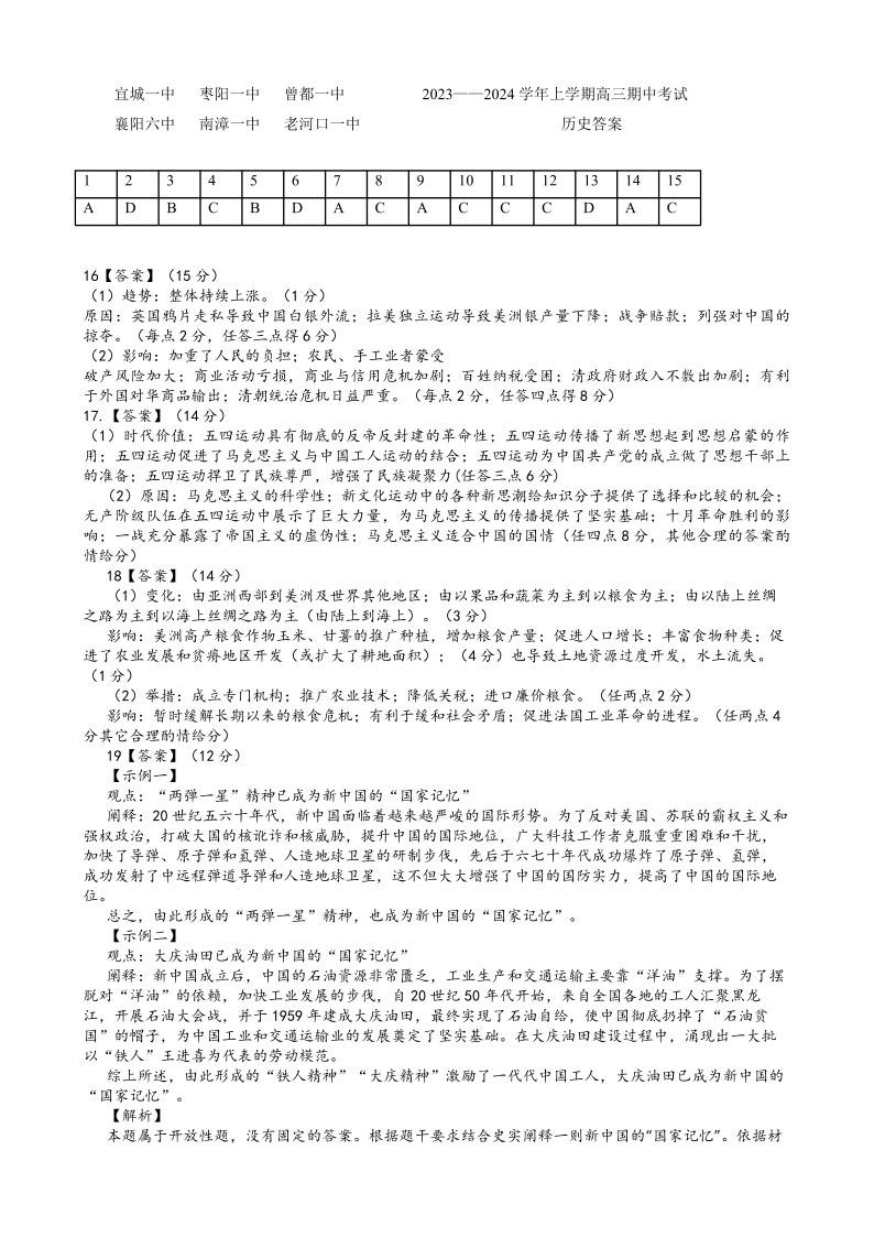 湖北省鄂东南六校2024届高三上学期期中考试历史答案