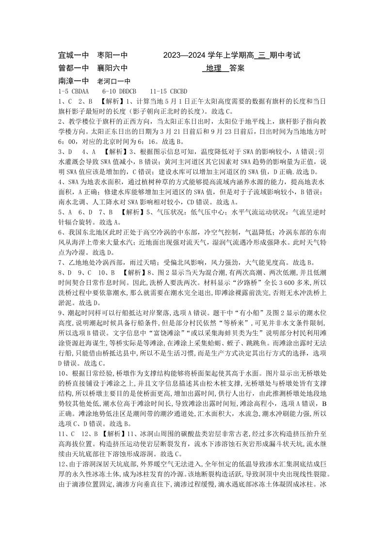 湖北省鄂东南六校2024届高三上学期期中考试地理答案