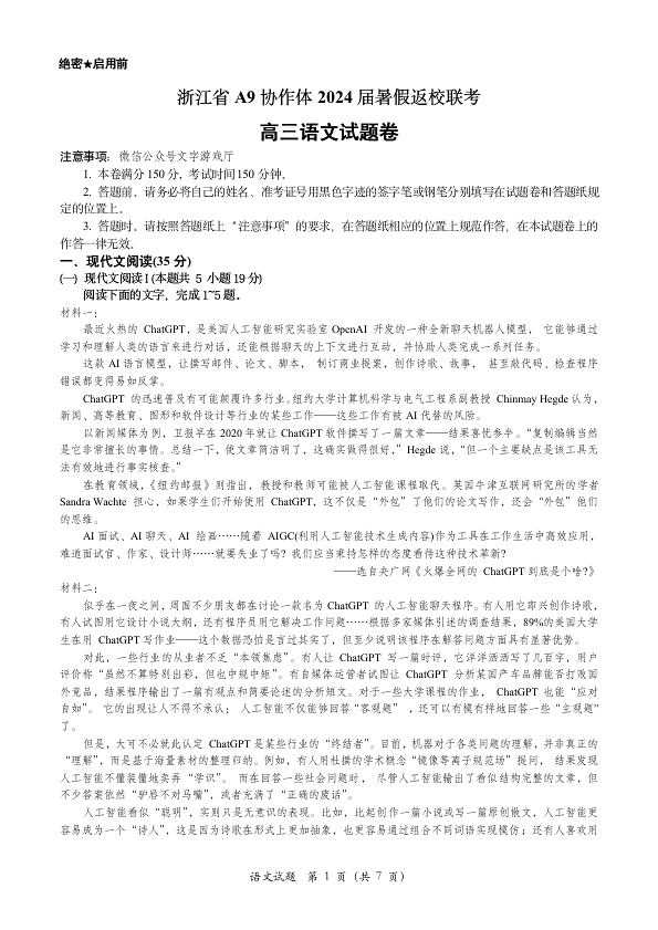 浙江省A9协作体2024届高三上学期暑假返校联考语文+答案