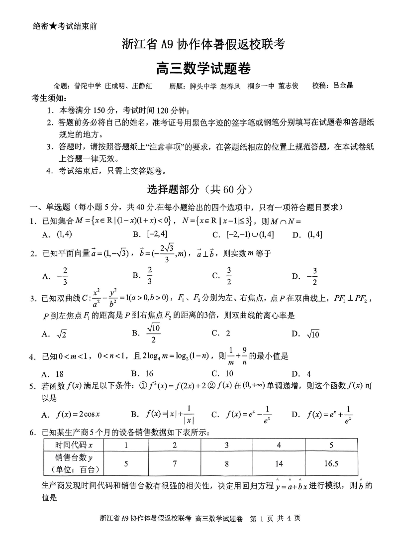 浙江省A9协作体2024届高三上学期暑假返校联考数学
