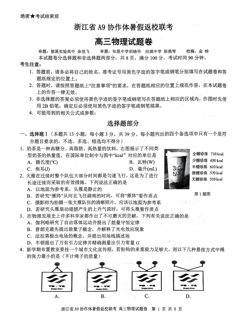 浙江省A9协作体2024届高三上学期暑假返校联考物理