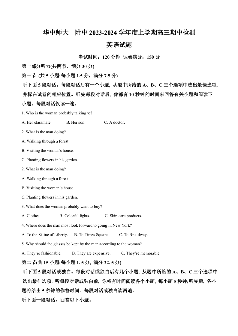 湖北省华中师范大学第一附属中学2024届高三上学期11月期中英语(原卷版)