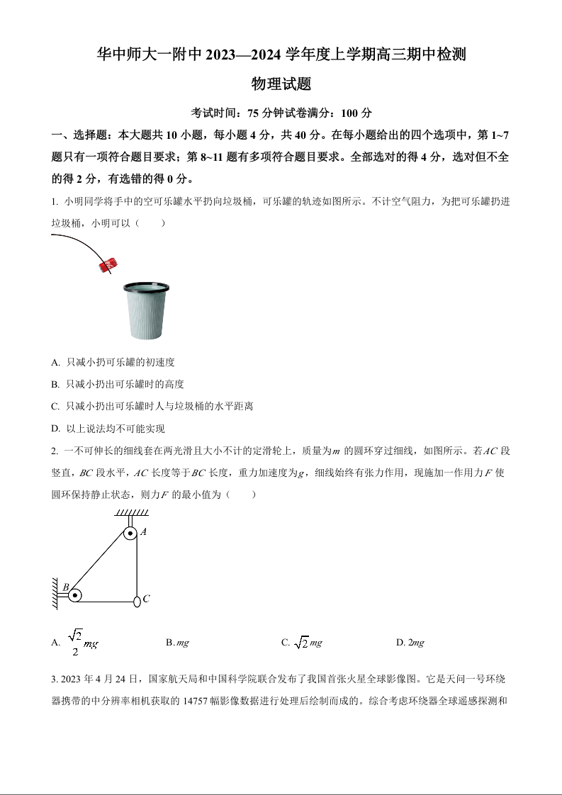 湖北省华中师范大学第一附属中学2024届高三上学期11月期中物理(原卷版)