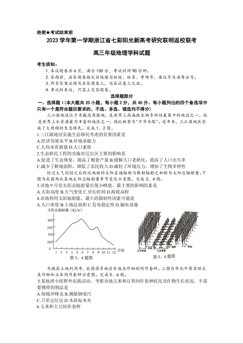 浙江省七彩阳光新高考研究联盟2024届高三上学期返校联考地理+答案
