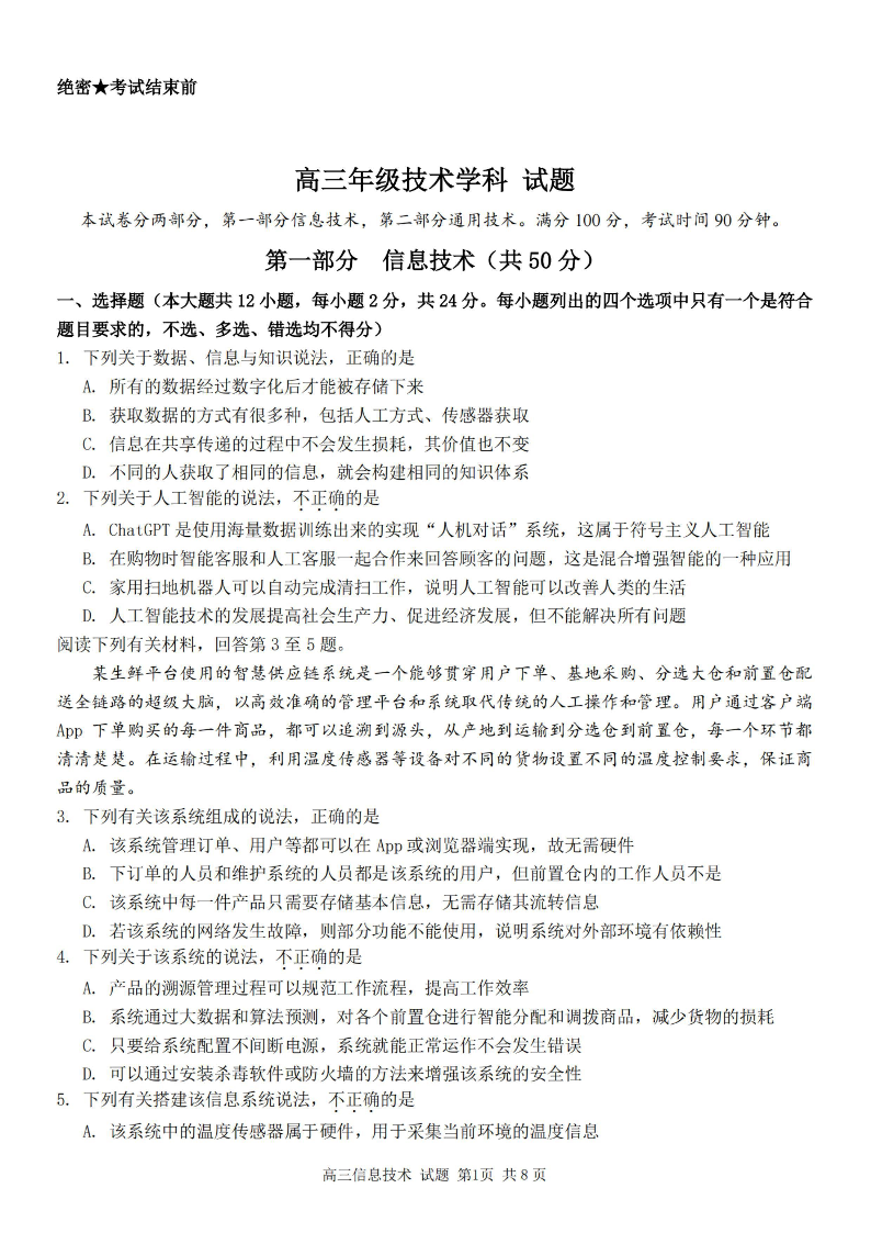 浙江省七彩阳光新高考研究联盟2024届高三上学期返校联考技术