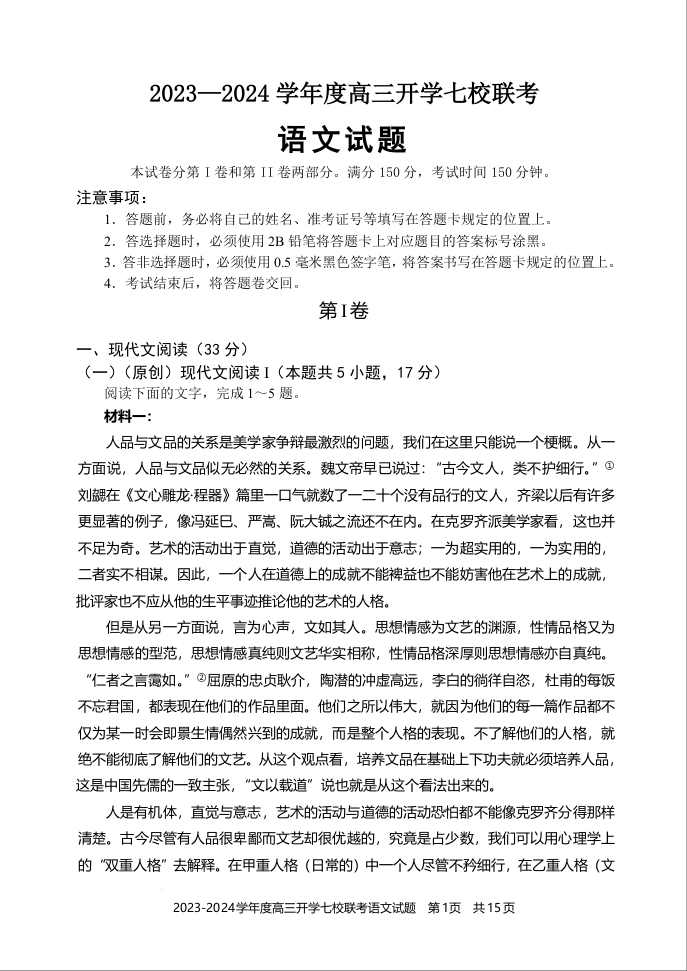重庆市七校2024届高三上学期开学考试语文+答案