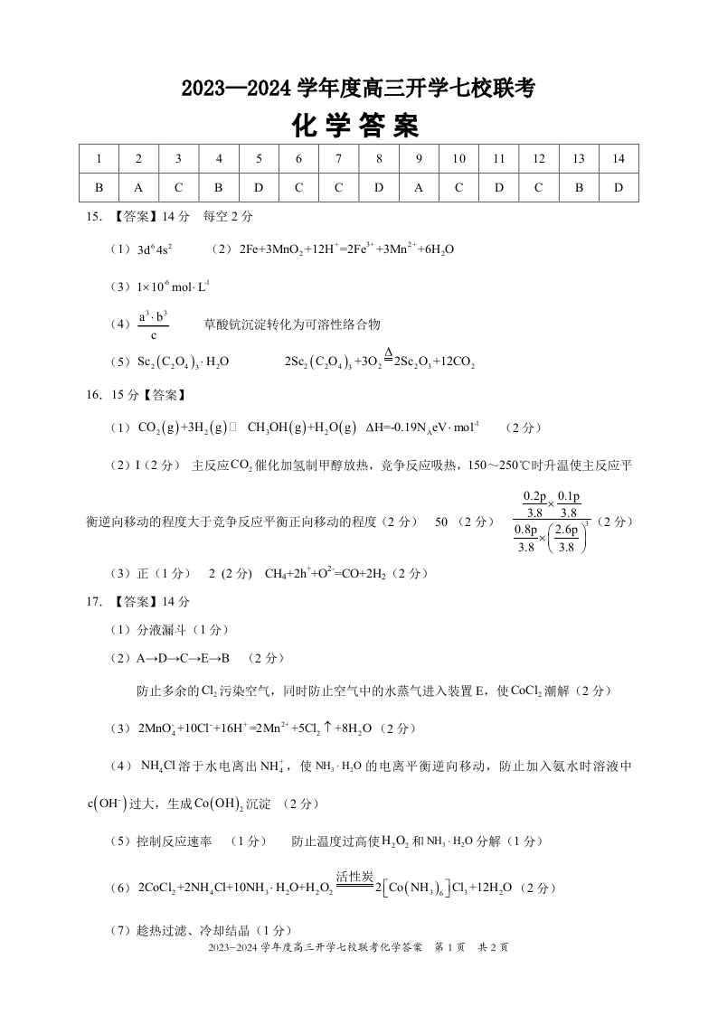 重庆市七校2024届高三上学期开学考试化学答案