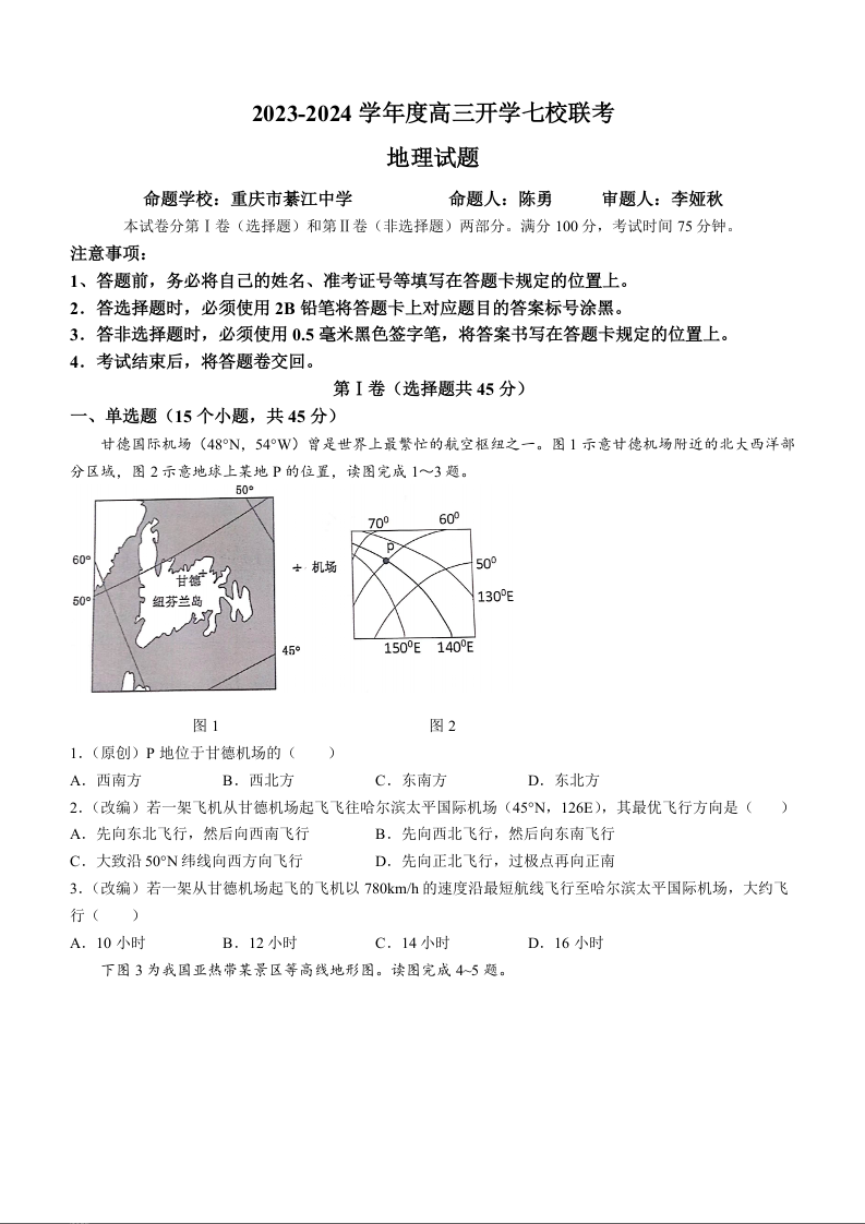 重庆市七校2024届高三上学期开学考试地理+答案