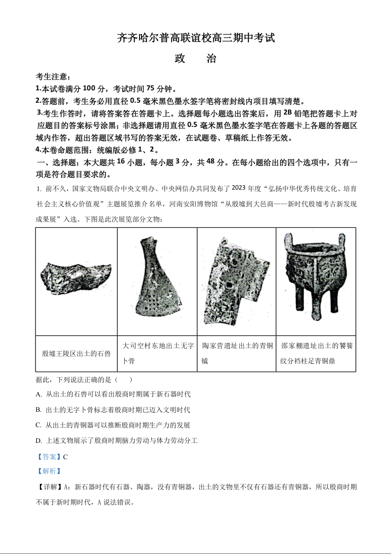 黑龙江省齐齐哈尔市普高联谊校2024届高三上学期期中考试政治(精品解析版)