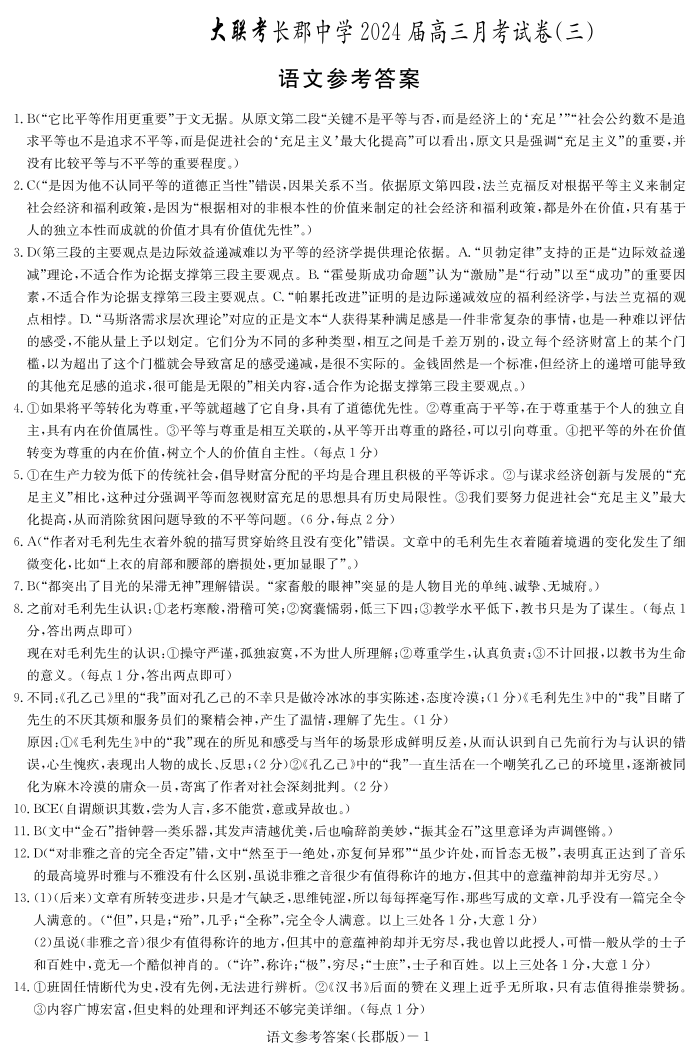 湖南省长沙市长郡中学2024届高三上学期月考(三)语文答案