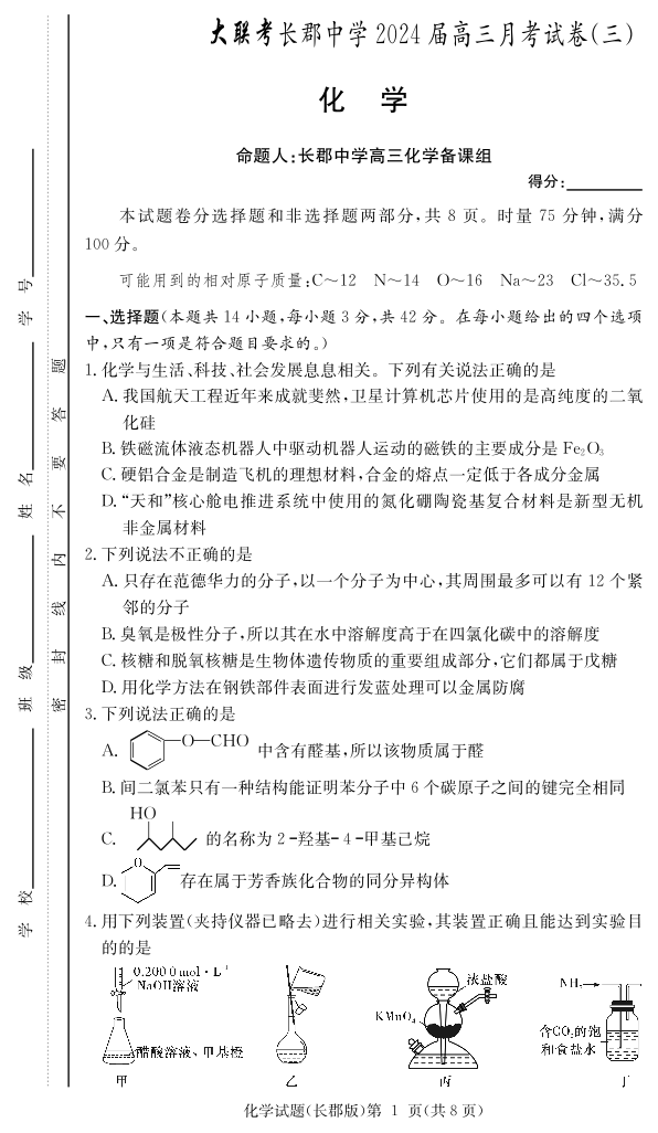 湖南省长沙市长郡中学2024届高三上学期月考(三)化学