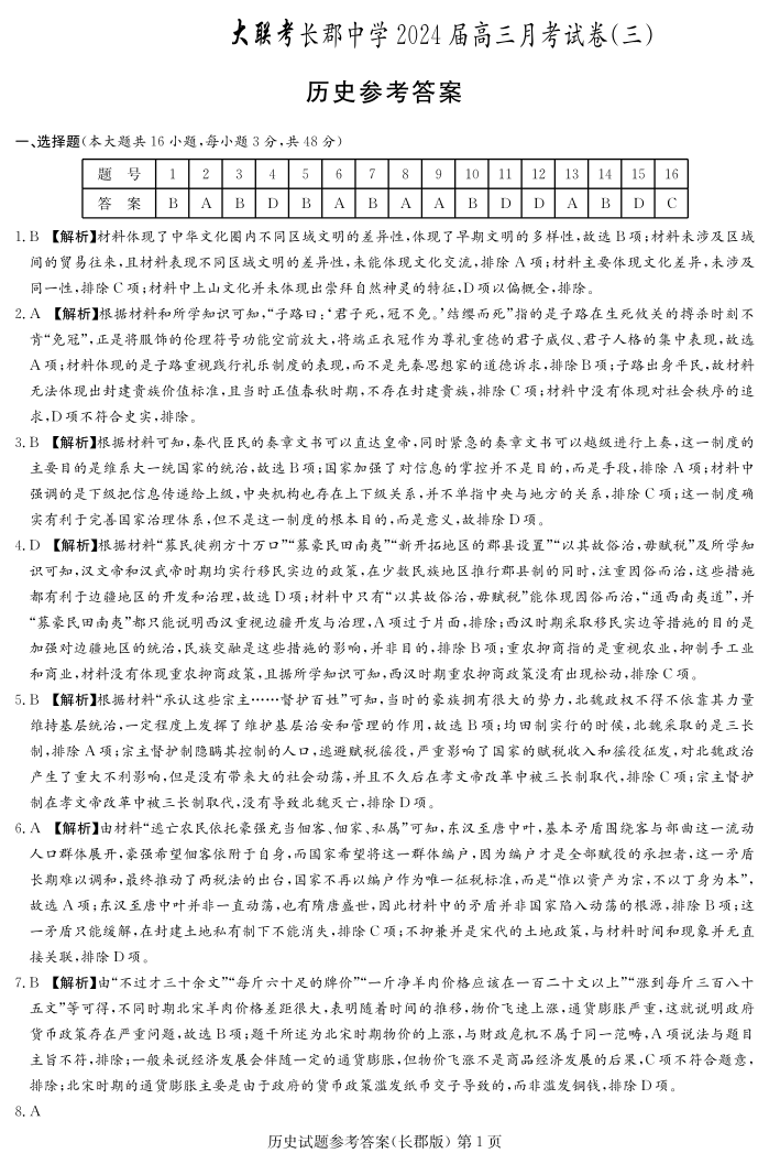 湖南省长沙市长郡中学2024届高三上学期月考(三)历史答案