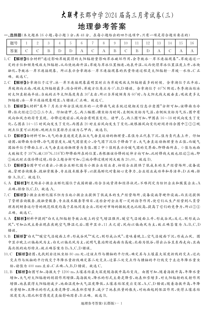 湖南省长沙市长郡中学2024届高三上学期月考(三)地理答案