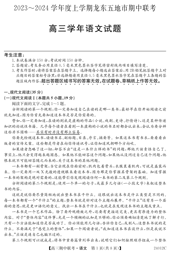 黑龙江省龙东五地市2024届高三上学期期中联考语文