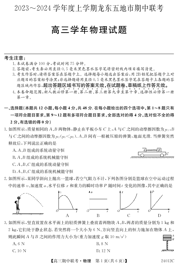 黑龙江省龙东五地市2024届高三上学期期中联考物理