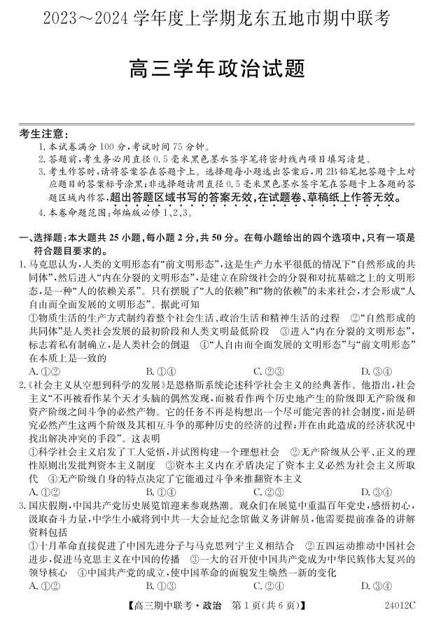 黑龙江省龙东五地市2024届高三上学期期中联考政治