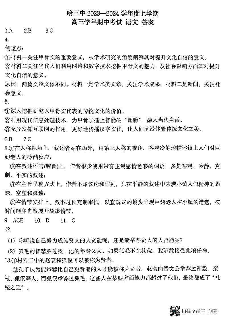 黑龙江省哈尔滨市第三中学校2024届高三上学期期中语文答案