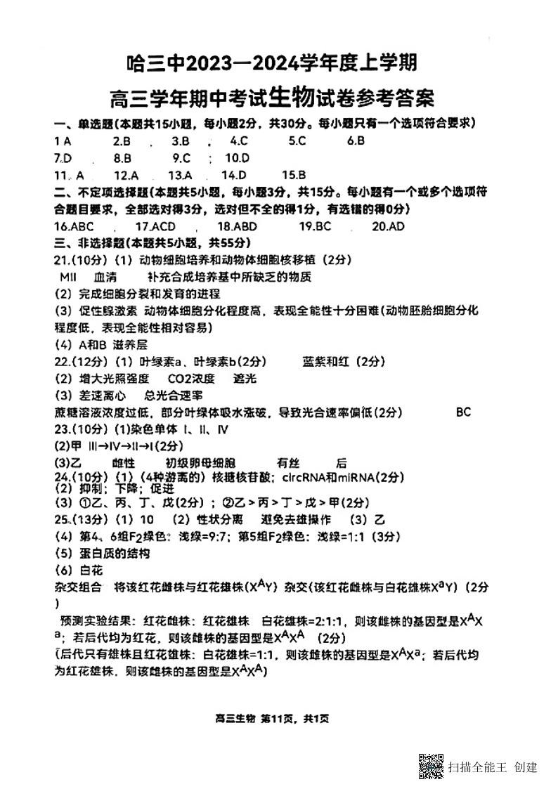 黑龙江省哈尔滨市第三中学校2024届高三上学期期中生物答案