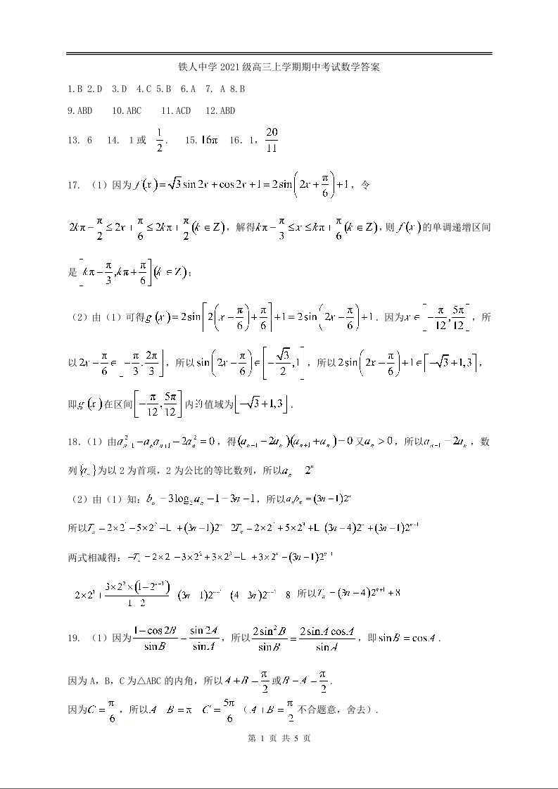 黑龙江省大庆铁人中学2024届高三上学期期中考试数学答案