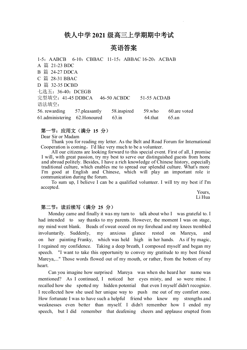 黑龙江省大庆铁人中学2024届高三上学期期中考试英语答案