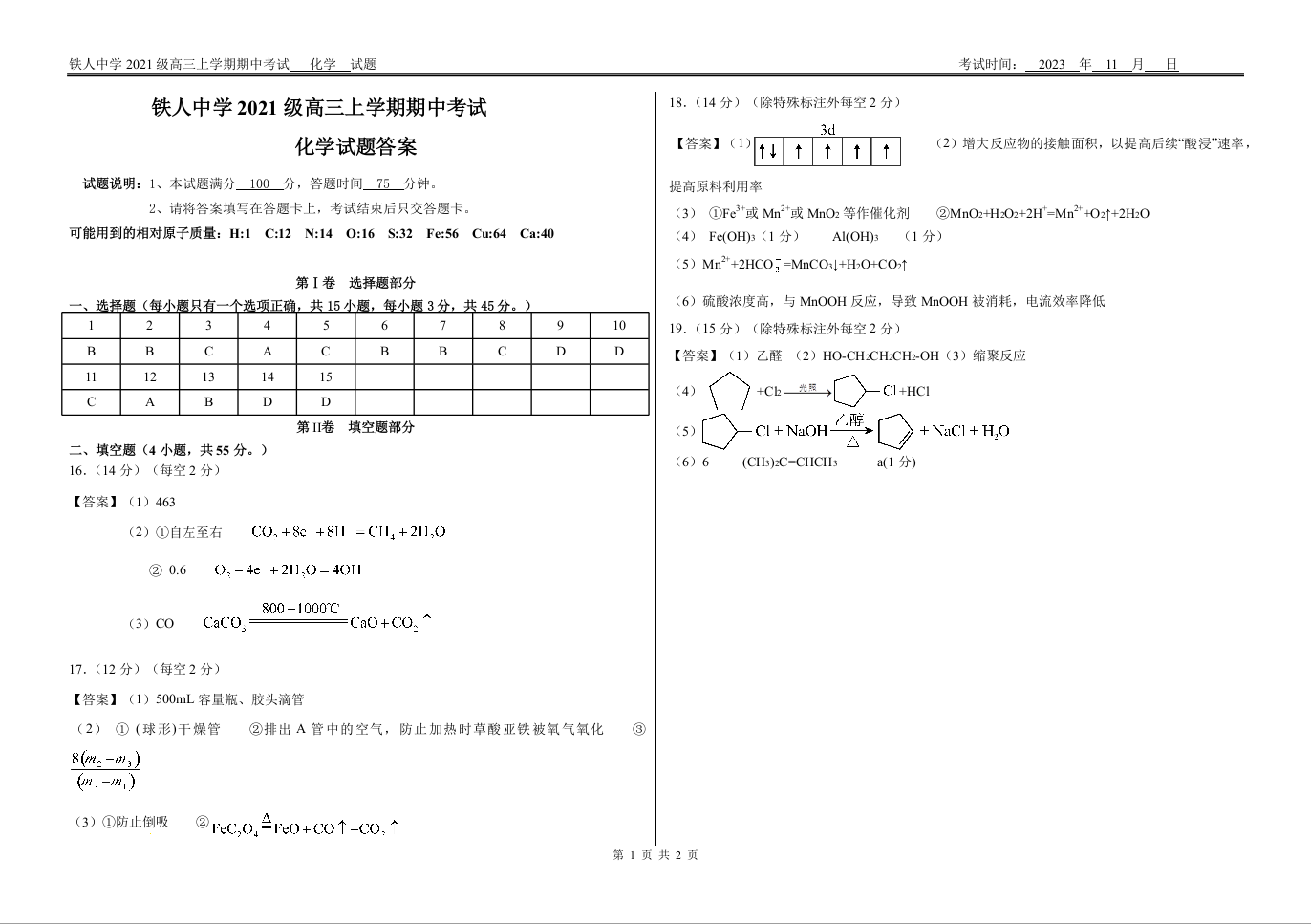 黑龙江省大庆铁人中学2024届高三上学期期中考试化学答案