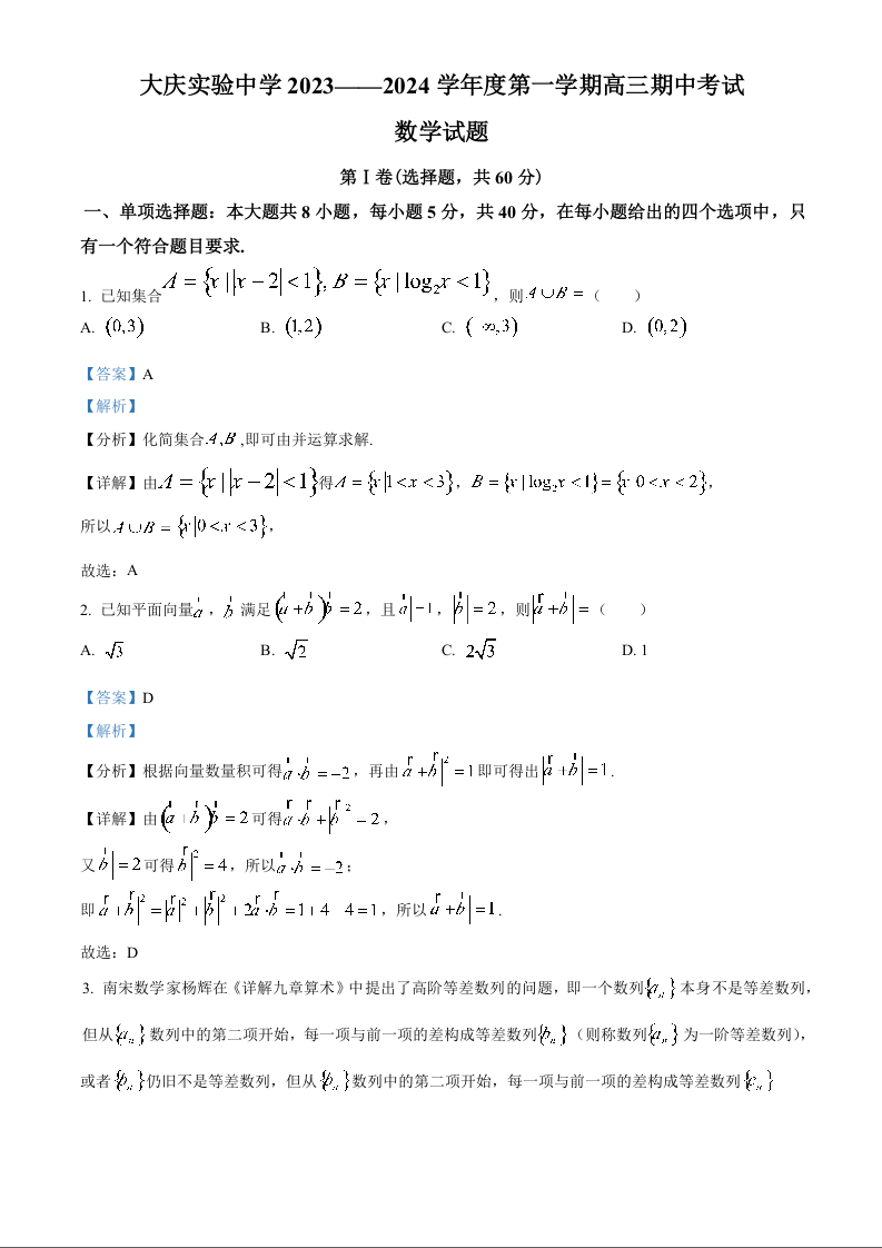 黑龙江省大庆实验中学2024届高三上学期期中考试数学(精品解析版)