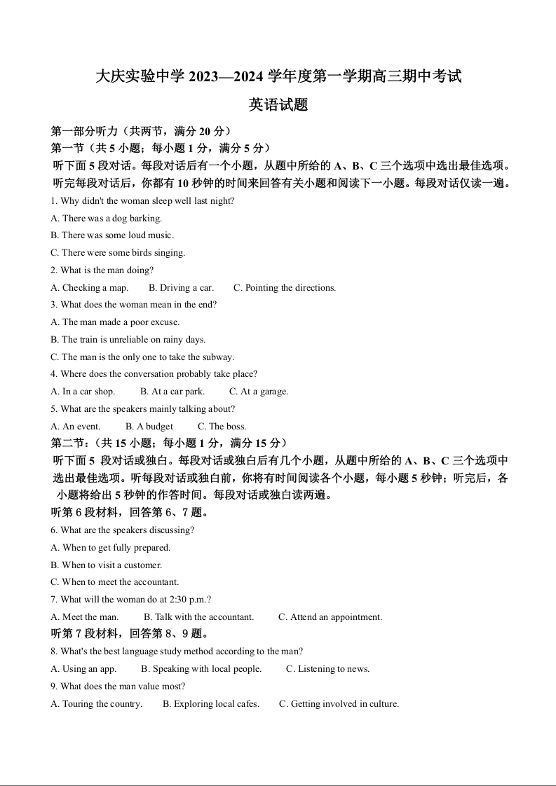 黑龙江省大庆实验中学2024届高三上学期期中考试英语(精品解析版)