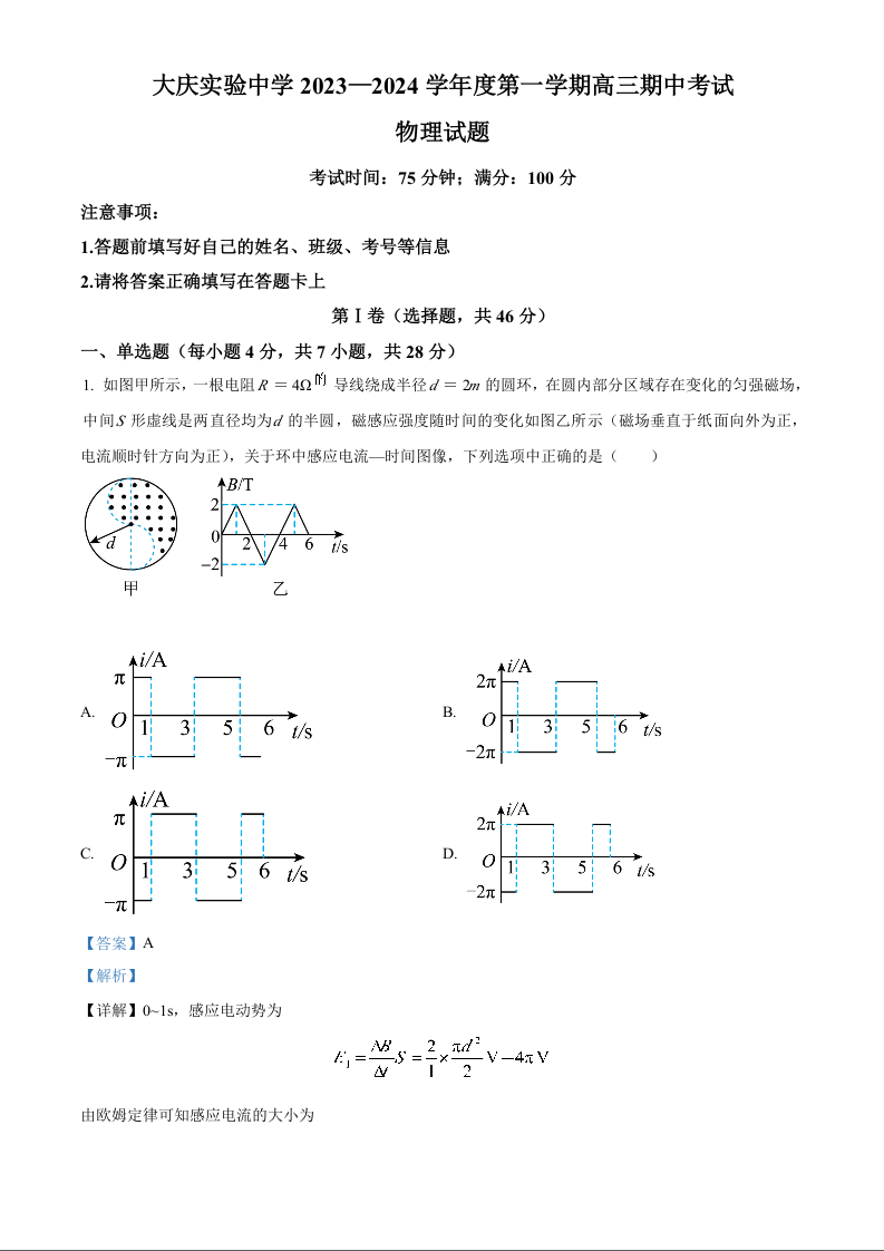 黑龙江省大庆实验中学2024届高三上学期期中考试物理(精品解析版)