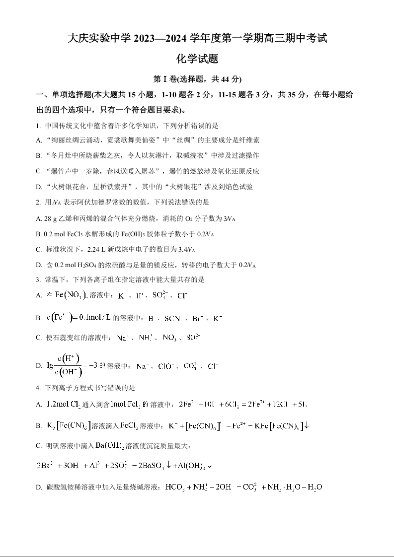 黑龙江省大庆实验中学2024届高三上学期期中考试化学(原卷版)