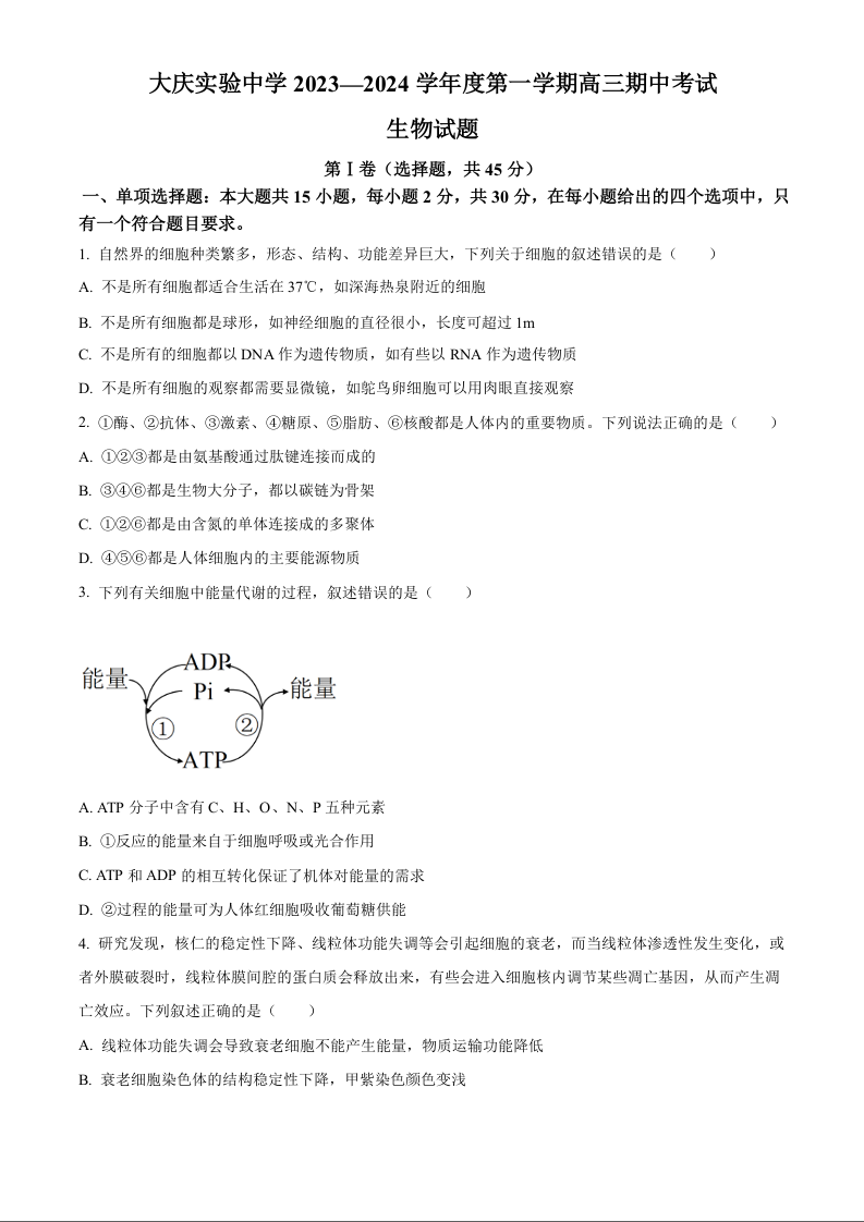 黑龙江省大庆实验中学2024届高三上学期期中考试生物(原卷版)