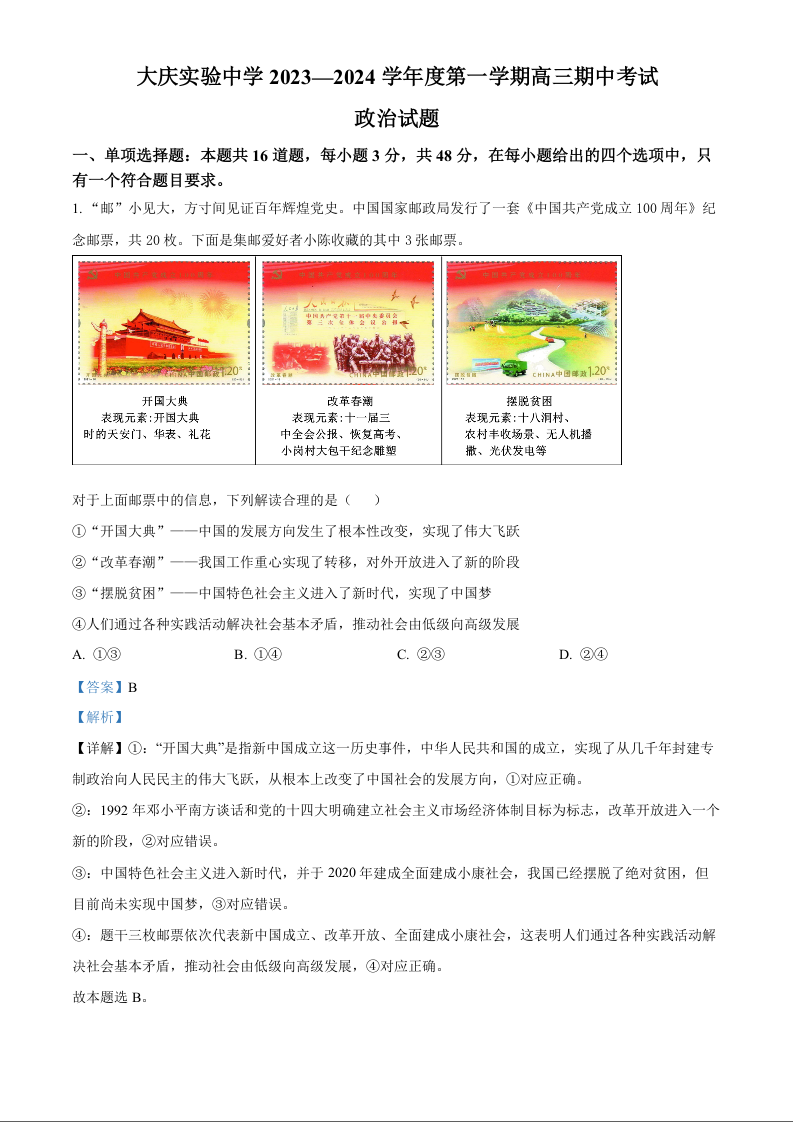 黑龙江省大庆实验中学2024届高三上学期期中考试政治(精品解析版)
