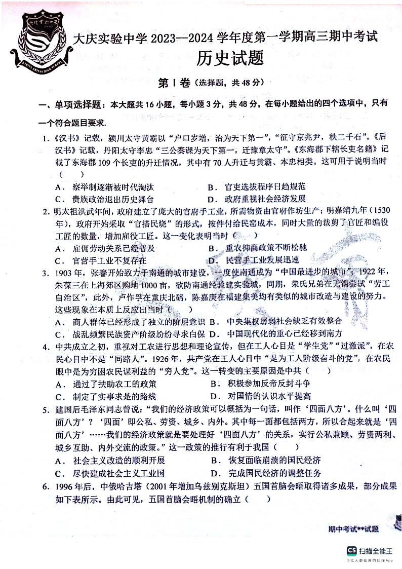 黑龙江省大庆实验中学2024届高三上学期期中考试历史