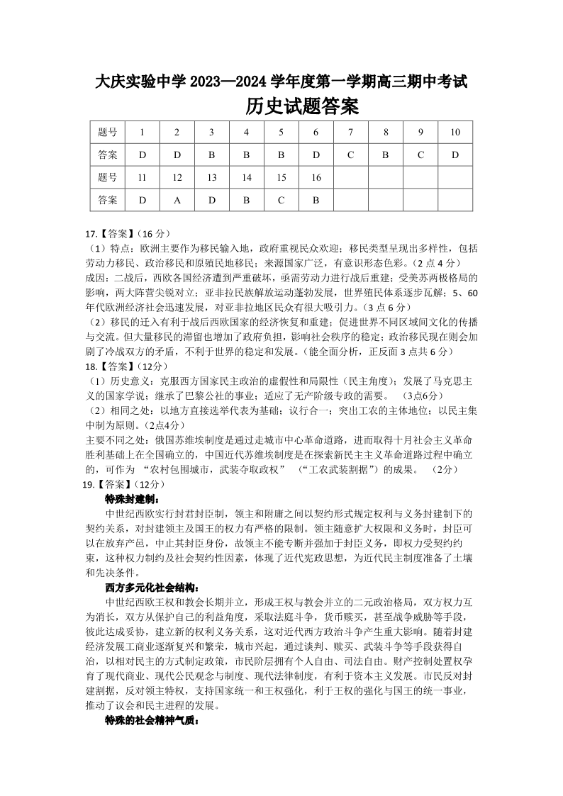 黑龙江省大庆实验中学2024届高三上学期期中考试历史答案