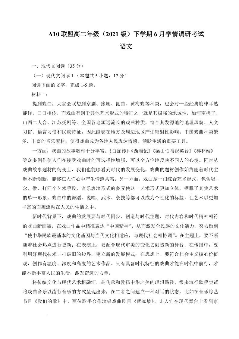 安徽省A10联盟2024届下学期6月学情调研考试语文