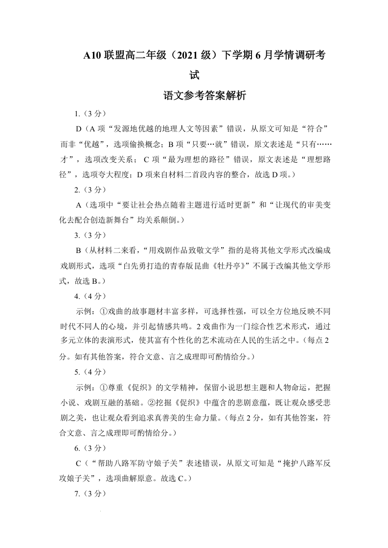 安徽省A10联盟2024届下学期6月学情调研考试语文答案