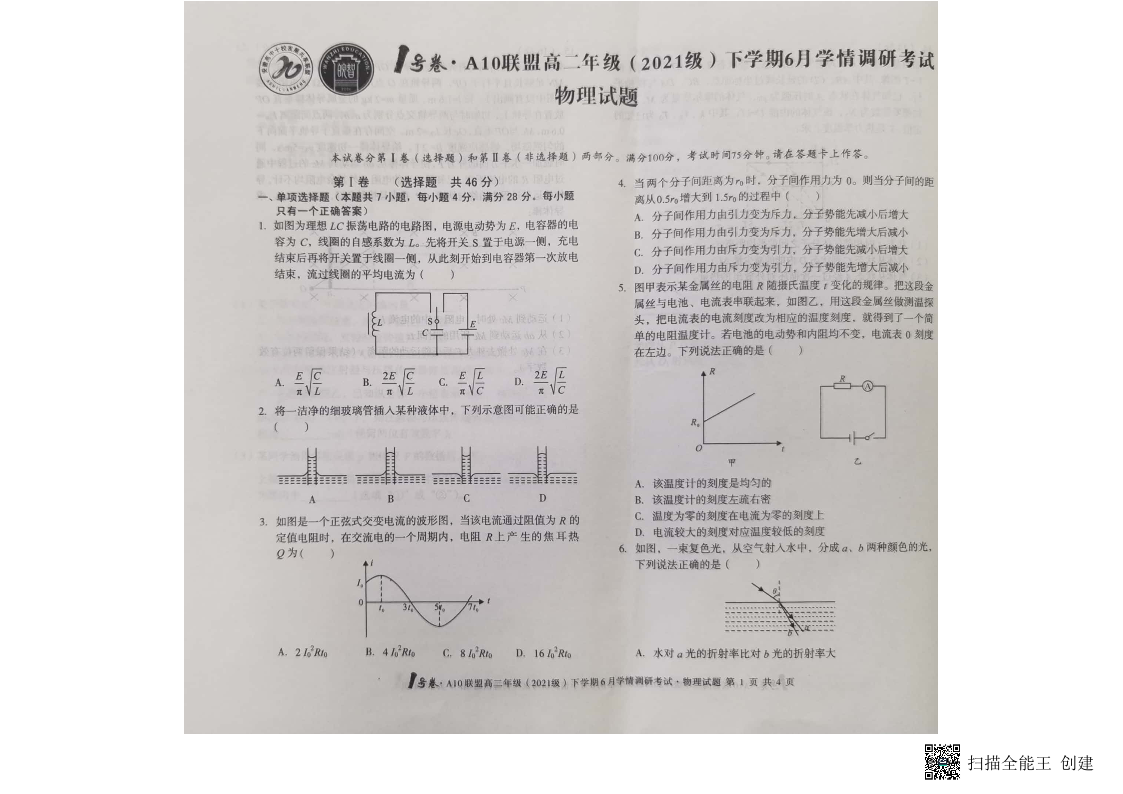 安徽省A10联盟2024届下学期6月学情调研考试物理