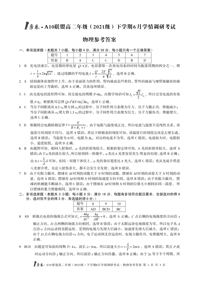 安徽省A10联盟2024届下学期6月学情调研考试物理答案