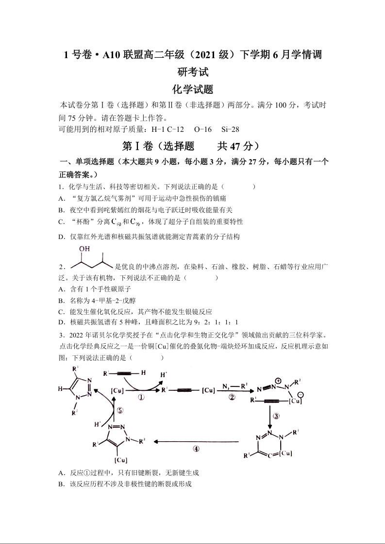 安徽省A10联盟2024届下学期6月学情调研考试化学+答案