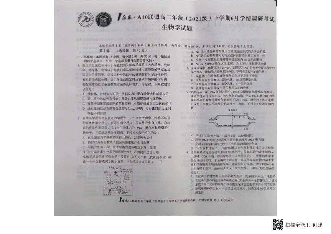 安徽省A10联盟2024届下学期6月学情调研考试生物