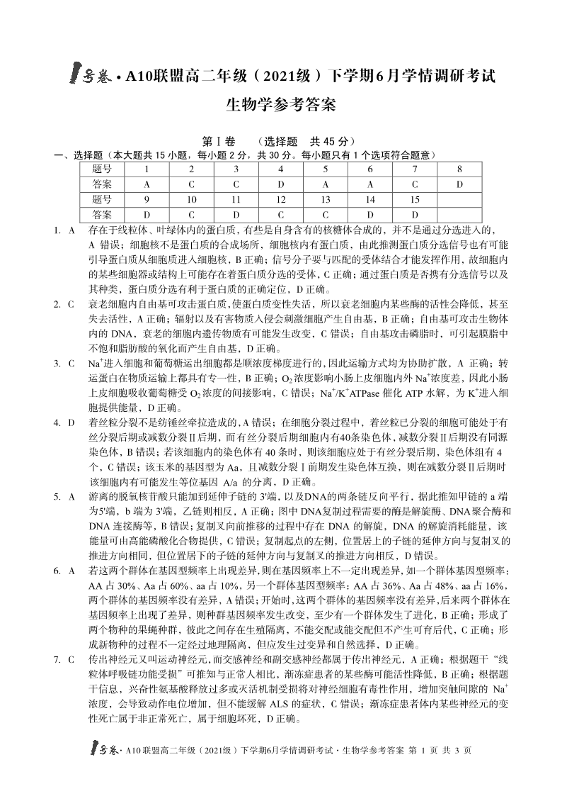 安徽省A10联盟2024届下学期6月学情调研考试生物答案
